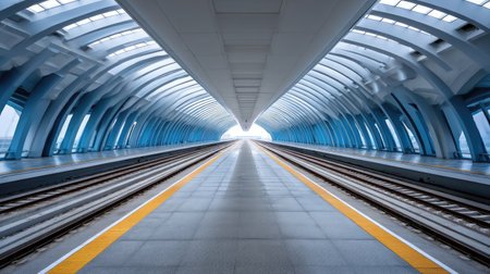 A long perspective view features a train station platform with tracks. The composition highlights symmetrical lines and architectural details. Soft lighting illuminates the scene, enhancing depth and dimension. This image is suitable for various commercial uses, including transportation and travel-related projects.
