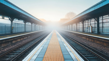 A breathtaking view of a tranquil train station at dawn, enveloped in fog, with clear tracks and empty platforms, inviting thoughts of travel and adventure.