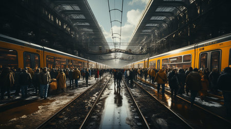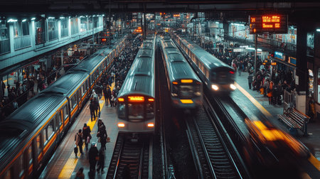 A panoramic view of a busy electric train station during rush hour, with multiple trains and crowds of passengers, capturing the dynamic energy of urban transit.