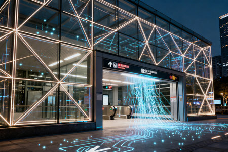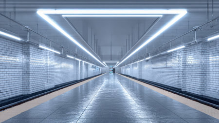 A modern subway interior featuring bright neon lighting and shimmering tiles, creating a minimalist and clean urban ambiance, perfect for travel themes.