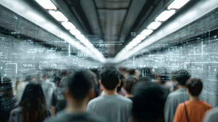 People walking in a futuristic tunnel with artificial intelligence data and information flowing, representing the concept of digital transformation and the future of technology