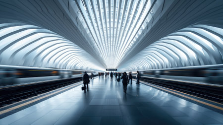A sleek and modern train station interior showcasing a symmetric design with a curved roof and bright lighting, creating a tranquil atmosphere for travelers.