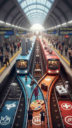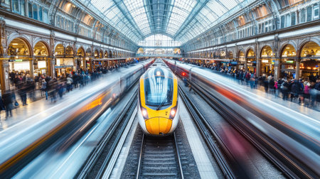 Detailed shot of a railway station with high-speed trains arriving and departing, and commuters waiting