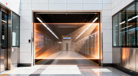 An open doorway reveals a futuristic subway platform with a vibrant, artistic display of light and motion