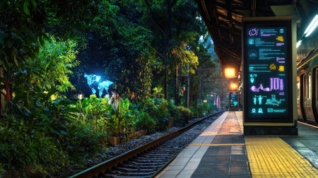 A tranquil train platform illuminated by vibrant lights at night, surrounded by lush greenery, capturing a serene blend of nature and urban life.
