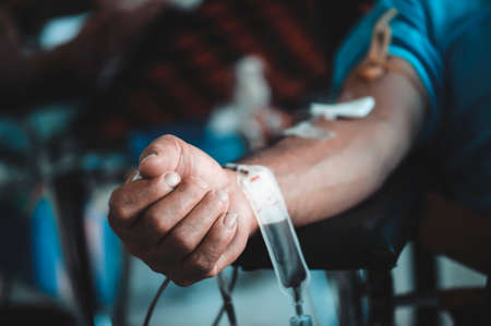 Blood donation in a hospital. Blood transfusion in the hands of a doctor.