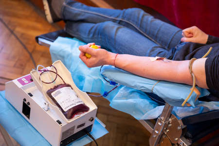 The hand of a man who donates blood. Male donor gives blood in a mobile blood donation center. Blood samples.