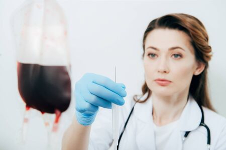 Nurse in uniform standing near the medical equipment and preparing dropper for donor at hospital