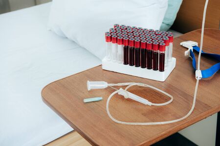 Bed with pillow, blood test tubes, tourniquet and syringe in hospital ward
