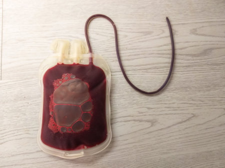 A blood bag with tube placed on a wooden surface, used for donation, transfusion, or hospital blood bank storage