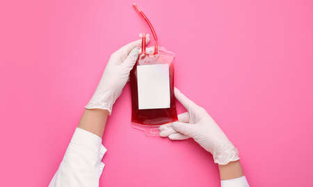 A red bag with a label that says blood transfusion is on a table. A person is wearing gloves and is holding the bag
