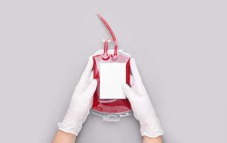 Hands of doctor with blood pack for transfusion on gray background