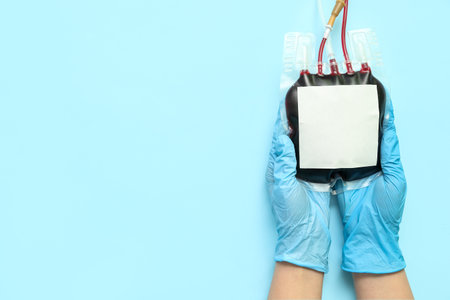 Blood pack on color background, top view with space for text. Donation day