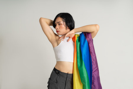 Image of Asian gay man holding a rainbow flag confidently posing on a white background