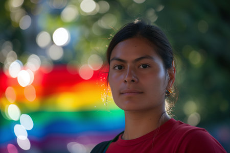 An AI generated illustration of A young woman standing confidently in front of a rainbow flag.