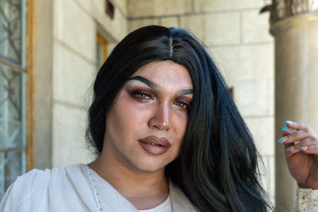 Drag queen posing close to old building in white dress. A wig with Black long hair and make up. High quality photo