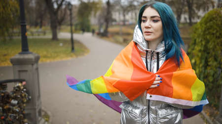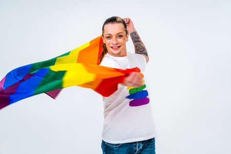 Portrait of a beautiful young woman with a rainbow flag in her hand