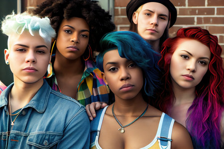 four girls with different colored hair styles, one is wearing a blue denim jacket and the other is wearing a white t - shirt. Generative AI