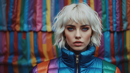 Portrait of a young beautiful woman in green coat with a short haircut and dyed hair. Grey main color and yellow, green, blue and red hair color. Posing in the street.
