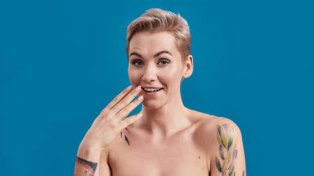 Mocking. Beauty portrait of a young attractive half naked tattooed woman with perfect skin looking surprised at camera with hand near her mouth isolated over blue background