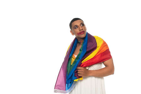 african american transvestite man, wrapped in lgbt flag, looking away isolated on white