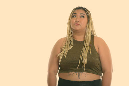 Youth asian transgender LGBT looking at camera while posing isolated over nude color background.