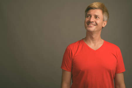 handsome man wearing red leather jacket portrait. Futuristic cyberpunk fashion style. Studio light shot on white background