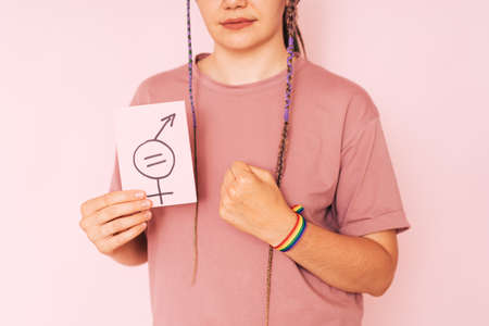 Girl with an LGBT bracelet on her hand shows sign of gender equality