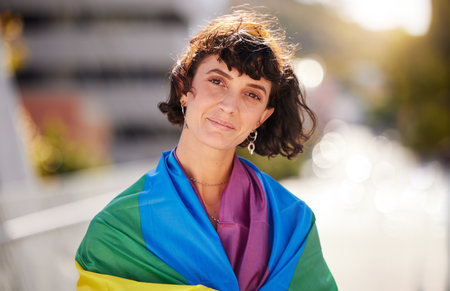 Love, freedom and portrait of woman with pride flag in city, happy non binary lifestyle of equality and peace. Happiness, summer and fun for gender neutral people in lgbt rainbow community with smile