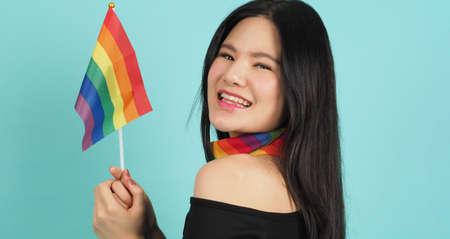 Portrait of young girl holding an LGBT flag standing against a blue green background studio. Asian LGBTQ woman with rainbow scarf on neck. look smart bright and energetic cheerful. LGBTQ concept.
