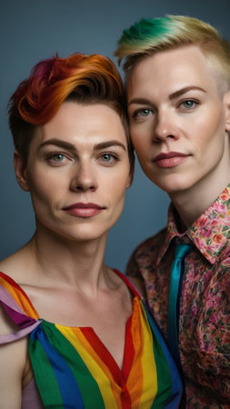 Portrait of two beautiful lesbian women with rainbow hair posing in studio