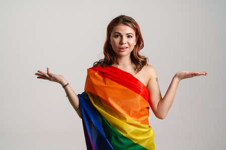 Portrait of happy young transgender wrapped in colorful rainbow flag of LGBT looking aside, touching face while posing isolated over light background