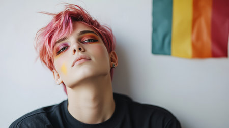 Young gay boy with pink hair and makeup expressing emotions against a white wall with lgbt flag
