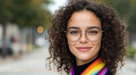 A young person smiles warmly while wearing a rainbow flag, symbolizing pride and inclusivity. The image captures a moment of joy and self-expression.