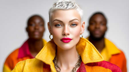 Models posing confidently in bright, colorful attire against a minimalist backdrop. Focus on stylish outfits and expressive looks. Concept of fashion, modeling, visual arts.