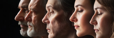 Five individuals with diverse appearances showcase their side profiles in a calm atmosphere, reflecting introspection and artistic expression in a dimly lit setting.