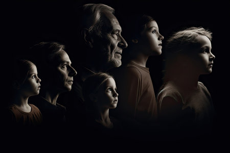 Different generations of family stand together against dark abstract background. Genealogical history of generations, preservation of the memory of relatives. Created with Generative AI
