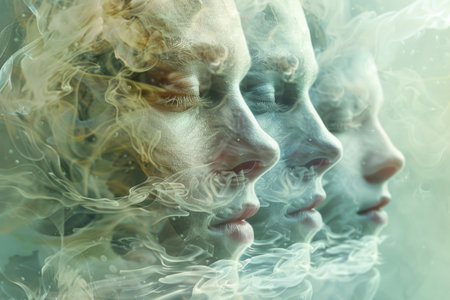A group of individuals releasing mysterious smoke from their faces in a surreal digital composition.