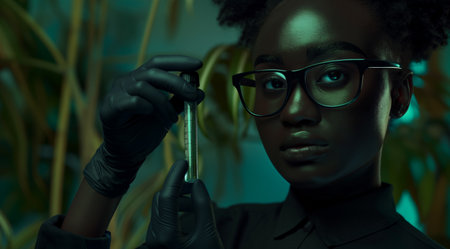 A magnificent hand holding a glowing DNA strand inside a test tube, beautifully set against lush greenery, symbolizing the harmony between science and nature.