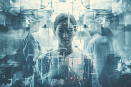 Double exposure photography of closeup doctor and the hospital operating room. Generative AI.