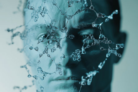 A thoughtful human face with intricate molecular structures gently overlaying the skin representing the complexities of gene therapy at a cellular level..