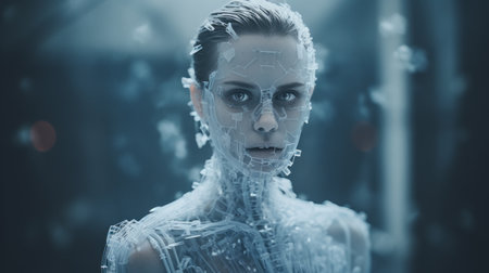 Artificial intelligence robot with its mechanics and wiring exposed is showing human like skin