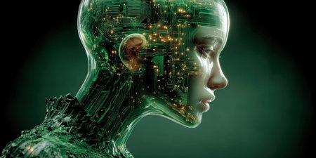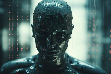 Illustration of Human-like Artificial Intelligence Head with Electronic Circuit Skin Texture and Computer Control Like