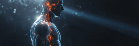 Translucent human silhouette showcases a glowing muscle system, highlighting futuristic anatomical visualization in a dark and atmospheric setting.