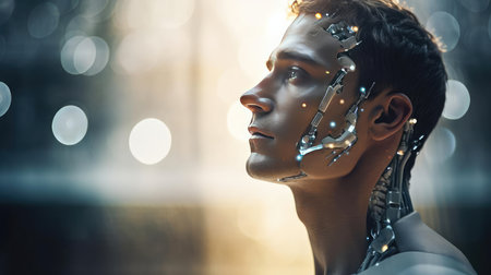 A detailed cyborg figure displays intricate circuitry and glowing lights. The profile shows a blend of human form and technology, set against a dark background.
