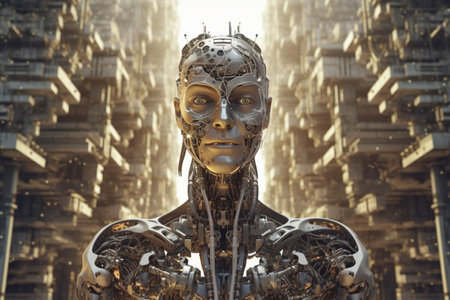 Humanoid figure features detailed circuitry and flowing golden hair, embodying a fusion of technology and artistry, creating a striking visual narrative of innovation