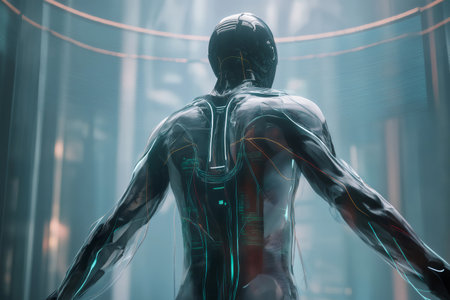 A human with transparent cybernetic enhancements, glowing circuits on a dark background, representing advanced technology concepts.