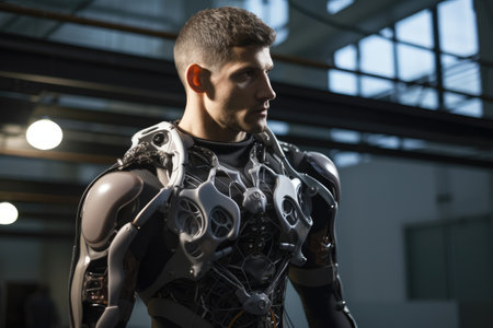 Symbiosis between human body and artificial intelligence and use of cells and partially mechanical limbs, skin, metal, visible energy flows, perfect human face. Generative AI