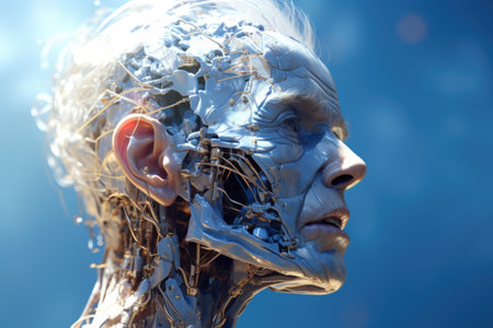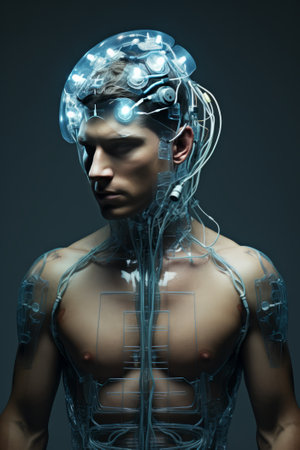 A human with transparent cybernetic enhancements, glowing circuits on a dark background, representing advanced technology concepts.