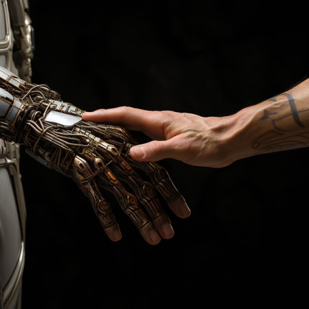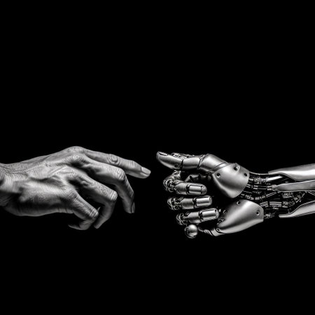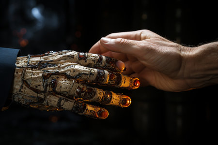 Close-up of a robotic hand reaching out to touch a human hand, symbolizing the connection between humans and technology, illuminated by soft lighting.